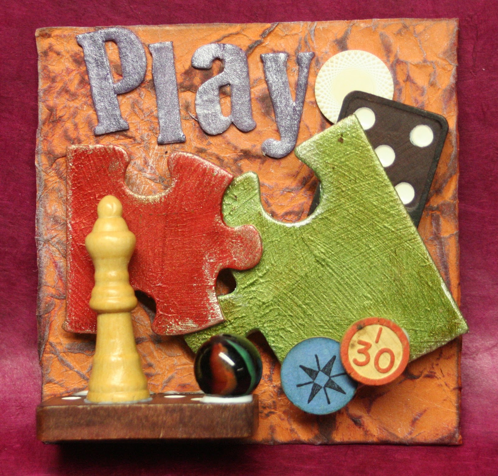 Well the prompt for day 2 is "What's your favorite animal? Use it as your inspiration" and it sent me thinking about how I was ever going to get todays project done. I enjoy animals but I've not really had one in my life on a daily basis for a while. Looking back my favorite pet growing up was our dog Wrinkles. Wrink, as we called him, died several years ago and I sat here pondering about how I was going to turn memories of Wrink into a project today then I remembered how much he loved to play-he would run for his ball forever or "work" at burying a bone under his blanket in the family room until it was just right. Ok, now I had a theme-PLAY, but what was I going to do with it? Then I remembered my friend Chrys' post yesterday about a challenge to create 4 inch "tiles" for an auction benefiting Reece's Rainbow-I now had a medium to work in and it was off to my studio to "create."